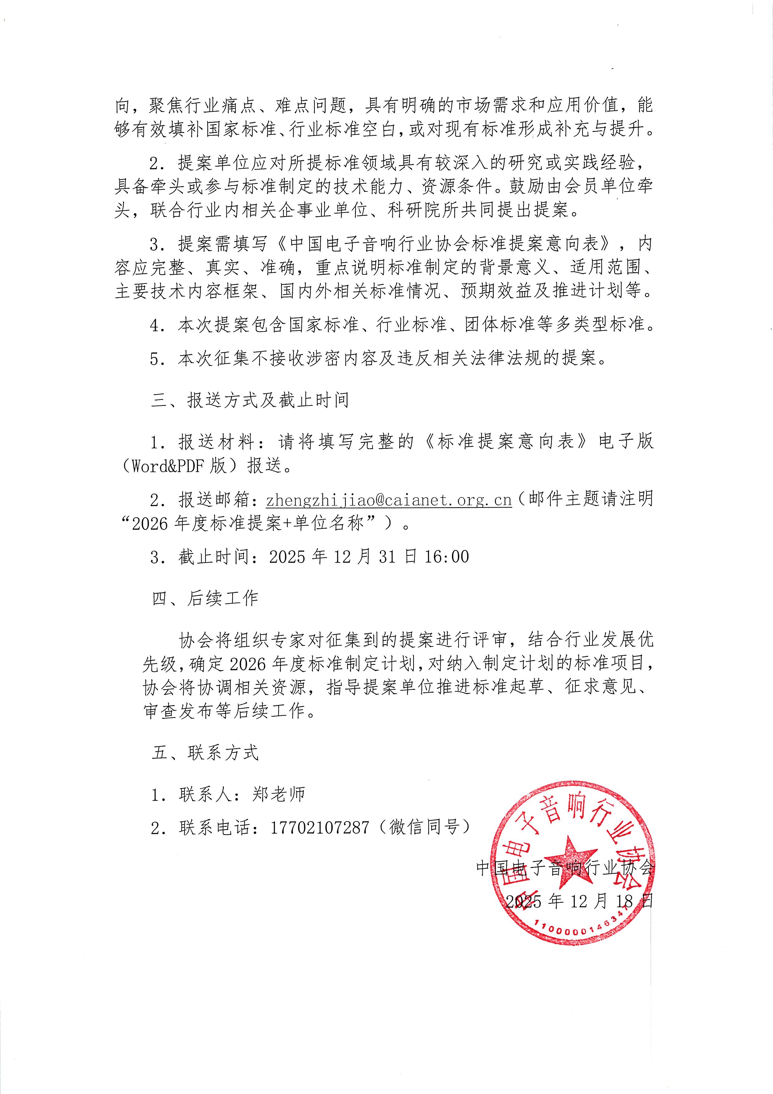 为深入贯彻落实国家标准化战略,精准对接行业发展需求,提升我国电子音响行业标准化水平,引领行业技术创新与高质量发展,依据《中华人民共和国标准化法》及相关规定,经研究决定,现开展2026年度标准提案征集工作。现将有关事项函告如下:一、征集范围本次标准提案征集范围涵盖电子音响行业全产业链相关领域,重点包括但不限于:1.新型音频产品及核心部件(如智能音箱、车载音响、专业音响、耳机、麦克风、音频芯片等)的技术要求、测试方法、质量评价体系;2.音频行业绿色低碳发展相关标准(如节能要求、环保材料应用、可回收利用技术、碳足迹核算等);3.音频产品智能化与数字化相关标准(如人工智能音频技术应用、物联网互联互通、音频数据安全与隐私保护、智能交互技术要求等);4.音频产业制造工艺与生产管理标准(如精密制造技术、质量控制流程、生产安全规范等);5.音频产品相关服务标准(如安装调试服务、售后服务规范、维修技术要求等);6.其他符合行业发展趋势、满足市场需求的关键技术与应用领域标准。二、提案要求1.提案应符合国家法律法规、产业政策要求,契合行业发展方向,聚焦行业痛点、难点问题,具有明确的市场需求和应用价值,能够有效填补国家标准、行业标准空白,或对现有标准形成补充与提升。2.提案单位应对所提标准领域具有较深入的研究或实践经验,具备牵头或参与标准制定的技术能力、资源条件。鼓励由会员单位牵头,联合行业内相关企事业单位、科研院所共同提出提案。3.提案需填写《中国电子音响行业协会标准提案意向表》,内容应完整、真实、准确,重点说明标准制定的背景意义、适用范围、主要技术内容框架、国内外相关标准情况、预期效益及推进计划等。4.本次提案包含国家标准、行业标准、团体标准等多类型标准。5.本次征集不接收涉密内容及违反相关法律法规的提案。三、报送方式及截止时间1.报送材料:请将填写完整的《标准提案意向表》电子版(Word&PDF版)报送。2.报送邮箱:zhengzhijiao@caianet.org.cn(邮件主题请注明“2026年度标准提案+单位名称”)。3.截止时间:2025年12月31日16:00四、后续工作协会将组织专家对征集到的提案进行评审,结合行业发展优先级,确定2026年度标准制定计划,对纳入制定计划的标准项目,协会将协调相关资源,指导提案单位推进标准起草、征求意见、审查发布等后续工作。五、联系方式1.联系人:郑老师2.联系电话:17702107287(微信同号)中国电子音响行业协会2025年12月18日