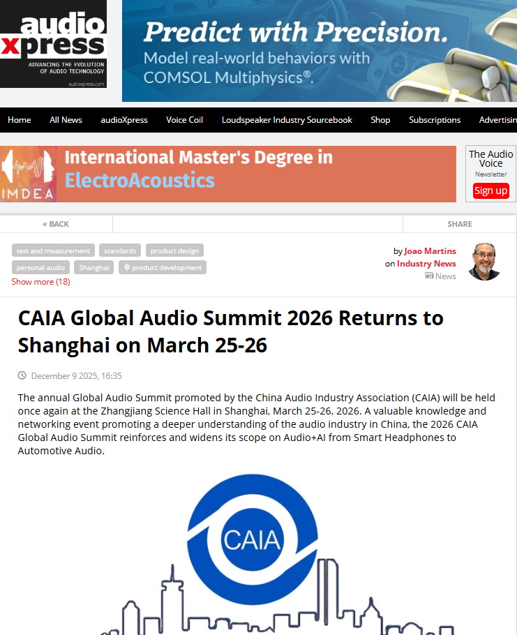·海外专业媒体主动发声:国际知名音频技术媒体AudioXpress于2025年12月发布题为《CAIA Global Audio Summit 2026 Returns to Shanghai》的深度报道,详细解析峰会主题与技术议程,强调中国音频市场对全球产业链的战略价值。