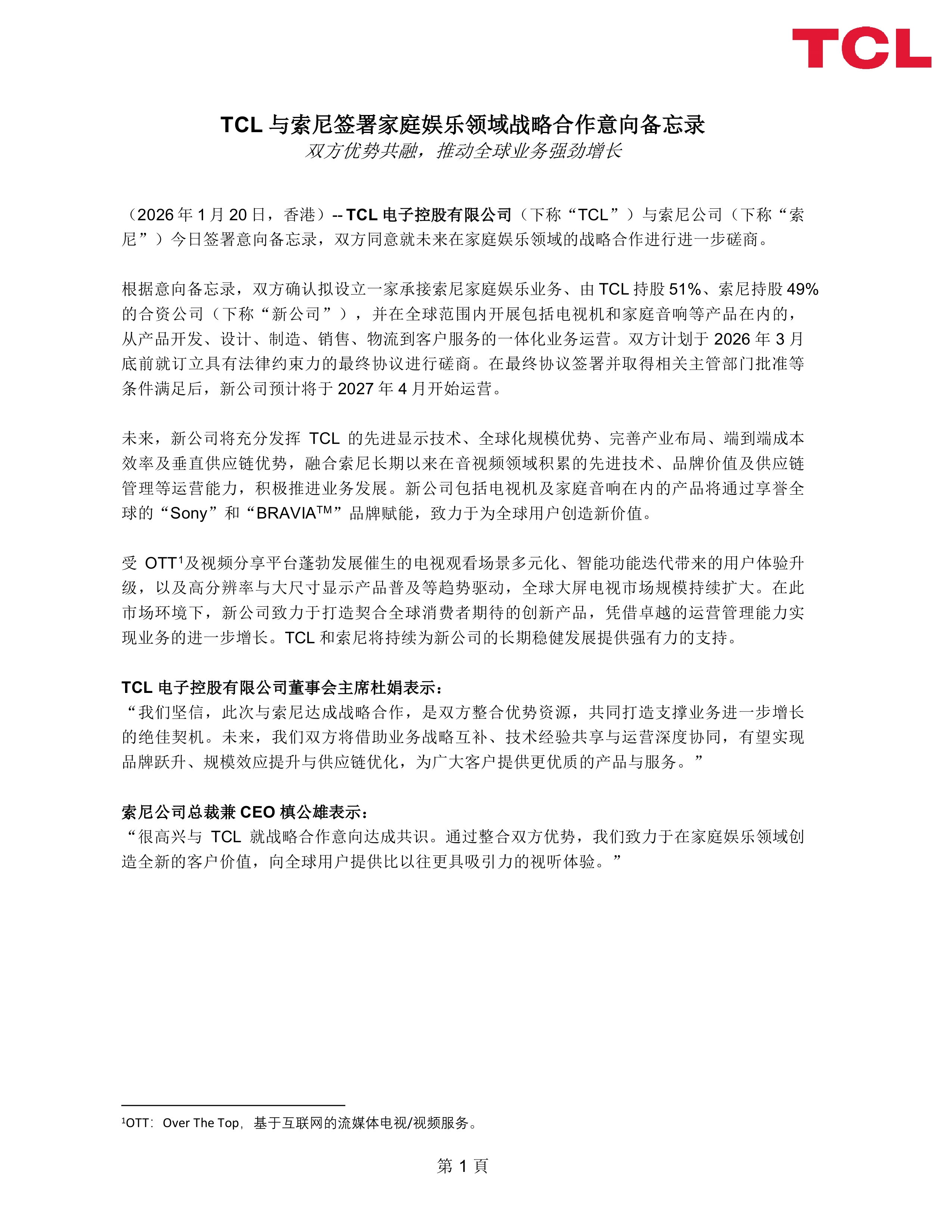 2026年1月20日,索尼公司与TCL电子同时发布公告,宣布双方已签署战略合作意向备忘录。核心内容是计划成立一家合资公司,以承接索尼旗下的家庭娱乐业务(主要包括电视机和家庭音响产品)。这并非一次简单的业务买卖,而是涉及品牌、技术、供应链与全球运营的深度战略重组,标志着全球电视产业竞争格局可能迎来一次历史性转折。