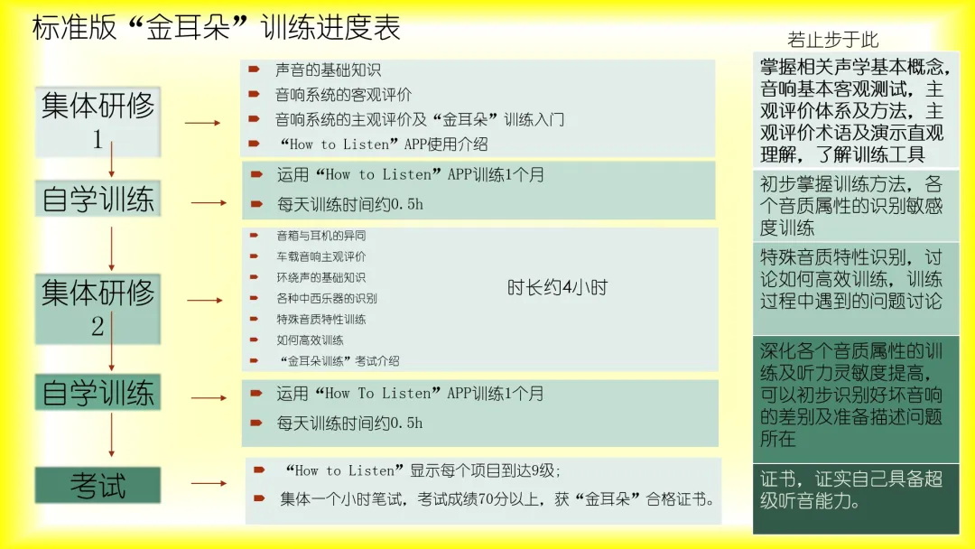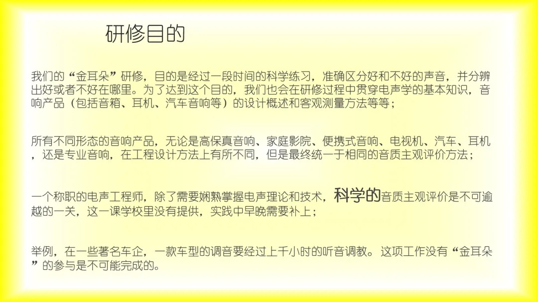 研修的目的,是经过一段时间的科学练习,准确区分好和不好的声音,并分辨出好或者不好在哪里。为了达到这个目的,我们也会在研修过程中贯穿电声学的基本知识,音响产品(包括音箱、耳机、汽车音响等)的设计概述和客观测量方法等等,以便对音响产品相关电声知识了解得更加全面。李胜波先生也会结合自己的丰富经验,在研修过程中答疑学员们在工作遇到的问题。