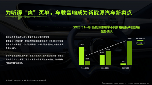 在硬件配置方面,为获得更佳聆听体验,消费者不仅关注高端耳机,也对车载音响等设备提出更高要求。《白皮书》数据显示,在20~30万元价位的新能源汽车中,近六成已配备10个以上扬声器,30万元以上车型的渗透率更高达94%,音质成为汽车差异化竞争的关键要素。