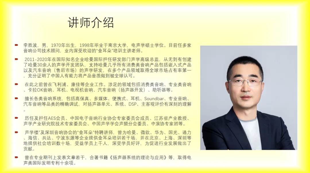 本次课程将由中国电子音响行业协会专家委员会委员、导师,著名声学专家,前哈曼科技高级声学总监李胜波先生担任主讲老师。学员将参加两次集中研修和由老师全程辅导的PC自主训练的课程,并通过严格的听音考试,经考核通过者将获得“金耳朵”研修课程证书。