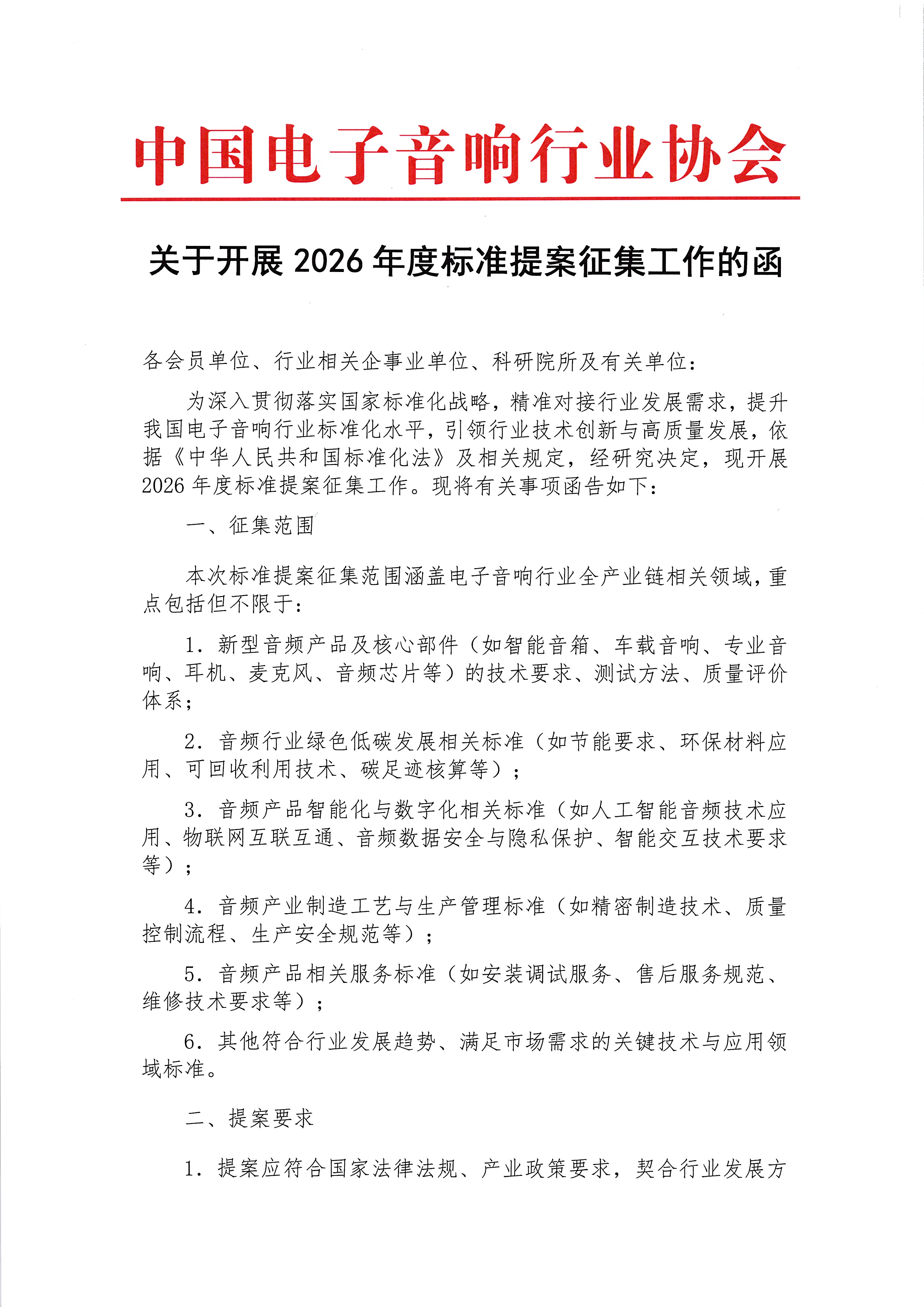 为深入贯彻落实国家标准化战略,精准对接行业发展需求,提升我国电子音响行业标准化水平,引领行业技术创新与高质量发展,依据《中华人民共和国标准化法》及相关规定,经研究决定,现开展2026年度标准提案征集工作。现将有关事项函告如下:一、征集范围本次标准提案征集范围涵盖电子音响行业全产业链相关领域,重点包括但不限于:1.新型音频产品及核心部件(如智能音箱、车载音响、专业音响、耳机、麦克风、音频芯片等)的技术要求、测试方法、质量评价体系;2.音频行业绿色低碳发展相关标准(如节能要求、环保材料应用、可回收利用技术、碳足迹核算等);3.音频产品智能化与数字化相关标准(如人工智能音频技术应用、物联网互联互通、音频数据安全与隐私保护、智能交互技术要求等);4.音频产业制造工艺与生产管理标准(如精密制造技术、质量控制流程、生产安全规范等);5.音频产品相关服务标准(如安装调试服务、售后服务规范、维修技术要求等);6.其他符合行业发展趋势、满足市场需求的关键技术与应用领域标准。二、提案要求1.提案应符合国家法律法规、产业政策要求,契合行业发展方向,聚焦行业痛点、难点问题,具有明确的市场需求和应用价值,能够有效填补国家标准、行业标准空白,或对现有标准形成补充与提升。2.提案单位应对所提标准领域具有较深入的研究或实践经验,具备牵头或参与标准制定的技术能力、资源条件。鼓励由会员单位牵头,联合行业内相关企事业单位、科研院所共同提出提案。3.提案需填写《中国电子音响行业协会标准提案意向表》,内容应完整、真实、准确,重点说明标准制定的背景意义、适用范围、主要技术内容框架、国内外相关标准情况、预期效益及推进计划等。4.本次提案包含国家标准、行业标准、团体标准等多类型标准。5.本次征集不接收涉密内容及违反相关法律法规的提案。三、报送方式及截止时间1.报送材料:请将填写完整的《标准提案意向表》电子版(Word&PDF版)报送。2.报送邮箱:zhengzhijiao@caianet.org.cn(邮件主题请注明“2026年度标准提案+单位名称”)。3.截止时间:2025年12月31日16:00四、后续工作协会将组织专家对征集到的提案进行评审,结合行业发展优先级,确定2026年度标准制定计划,对纳入制定计划的标准项目,协会将协调相关资源,指导提案单位推进标准起草、征求意见、审查发布等后续工作。五、联系方式1.联系人:郑老师2.联系电话:17702107287(微信同号)中国电子音响行业协会2025年12月18日