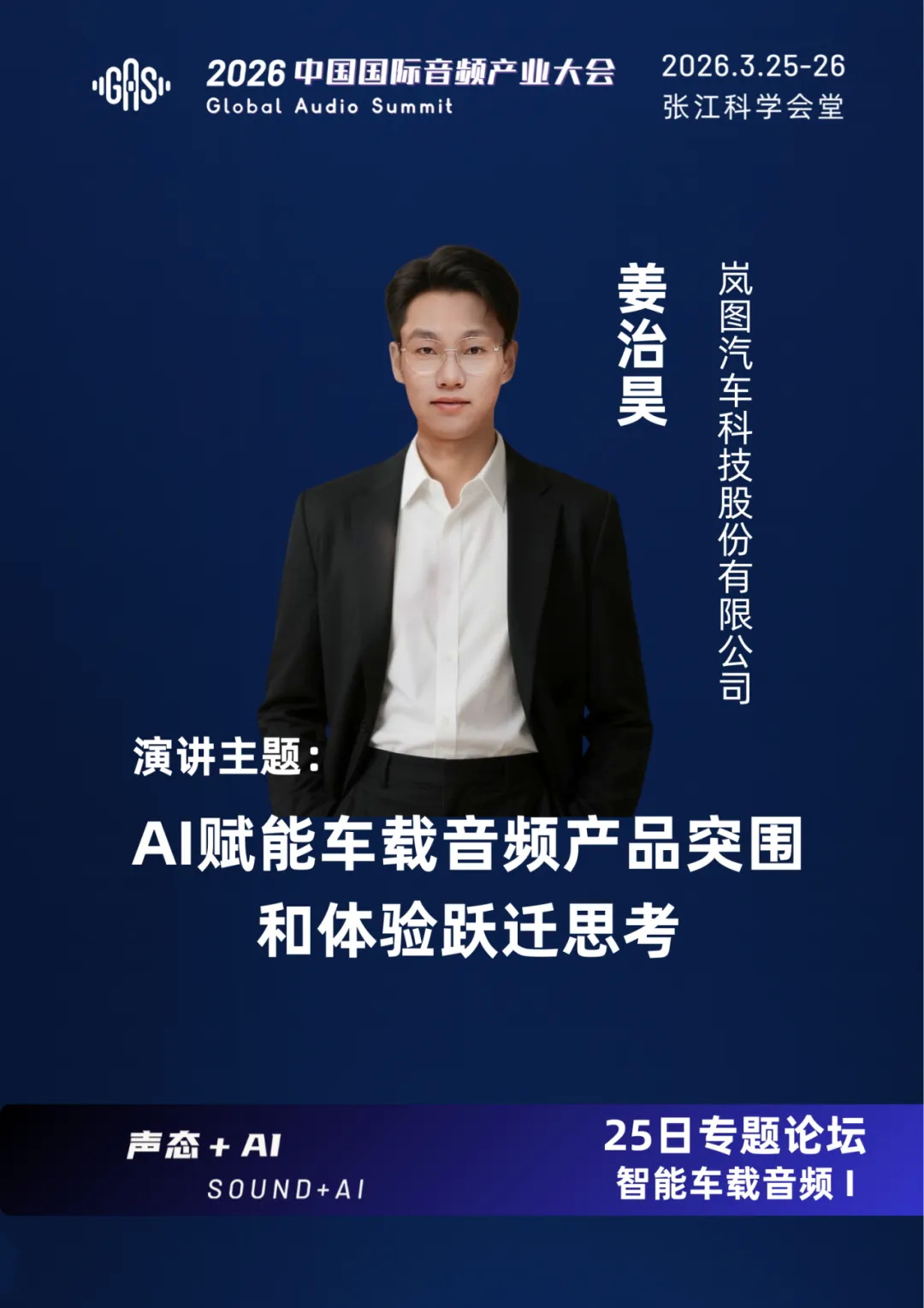 姜治昊,岚图汽车音频产品经理,从事音频领域9年,负责岚图座舱音频及音响系统前瞻规划、产品定义、落地及验收等全链路工作。专注新能源智能座舱声学体验创新与落地。