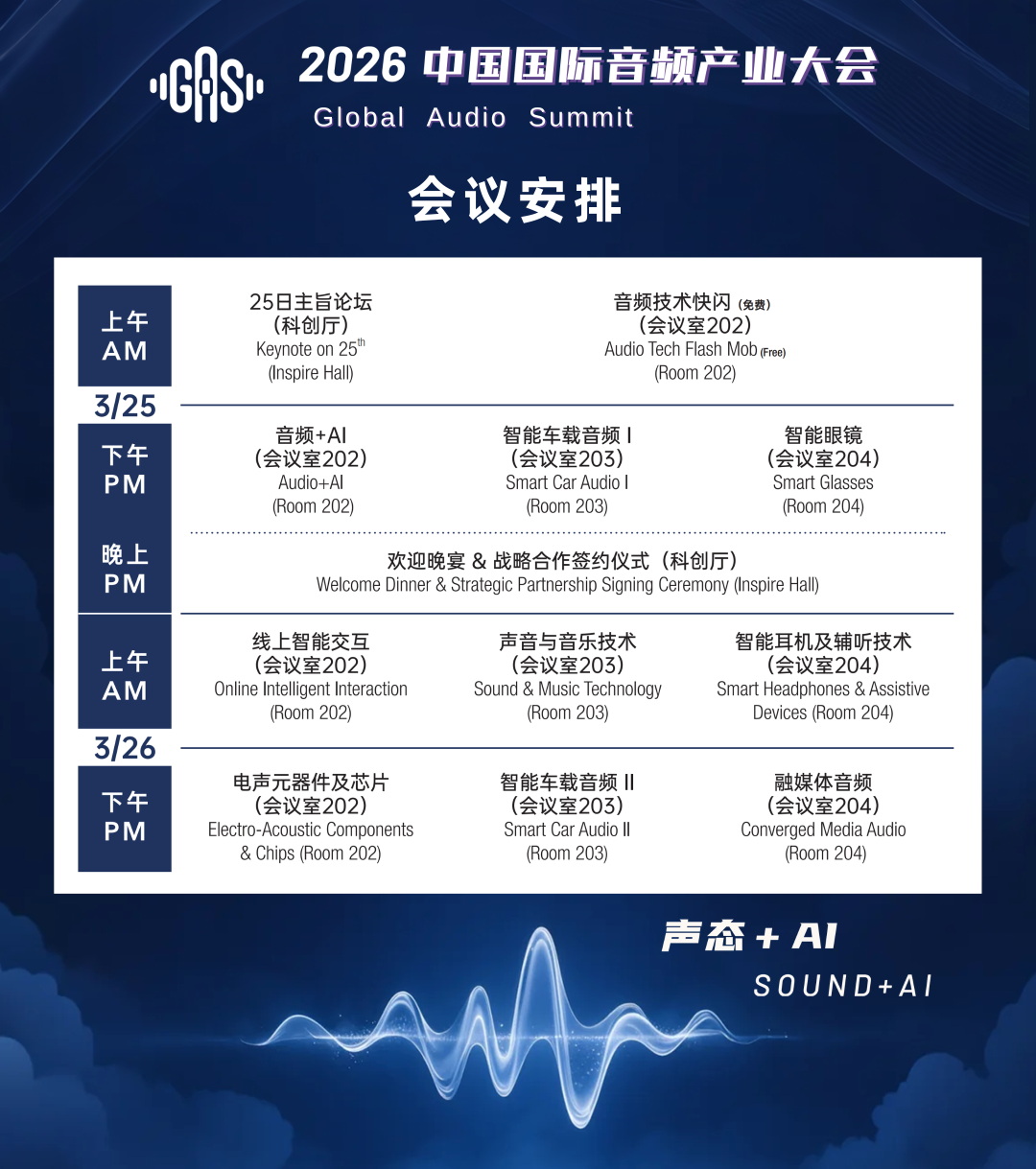 由中国电子音响行业协会、上海市浦东新区先进音视频技术协会共同主办,上海国展展览中心有限公司承办的2026中国国际音频产业大会(GAS)将于3月25-26日在上海张江科学会堂盛大举办!